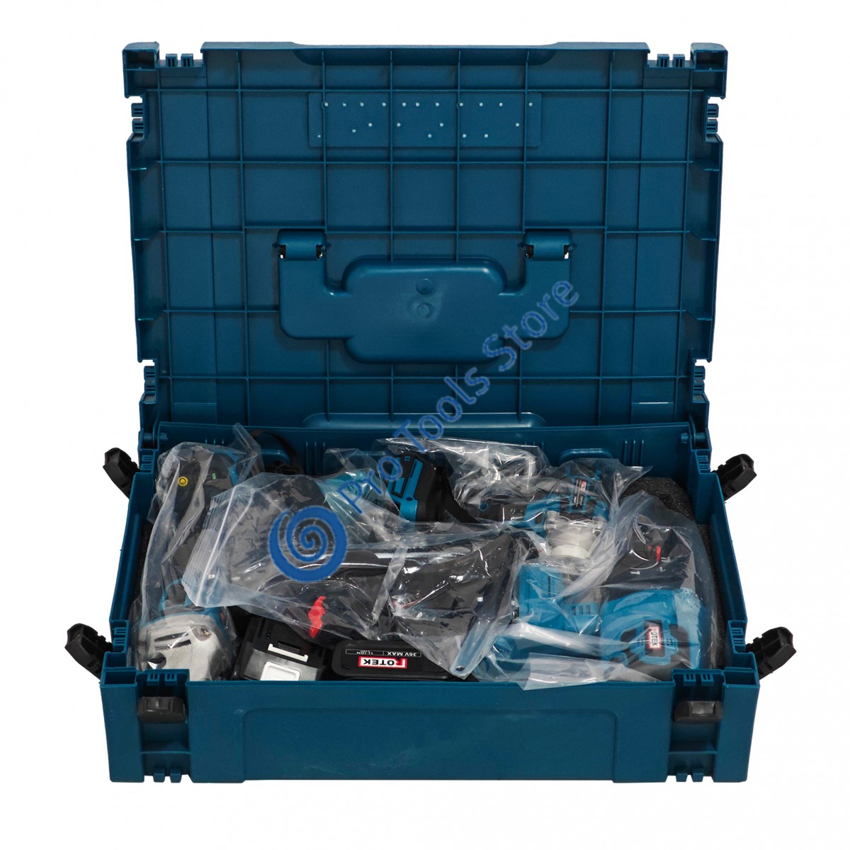 - Această trusă conține o autofiletantă, un rotopercutor, o cheie de impact și un polizor unghiular, toate alimentate de doi acumulatori puternici de 36V 5Ah.